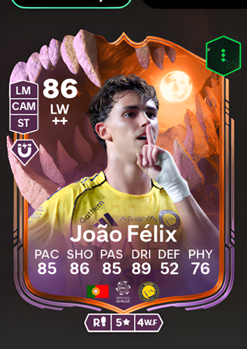 João Félix Sequeira's Ultimate Scream card stands out as an electrifying Left Wing option, boasting an impressive overall rating of 86. With standout attributes such as 85 pace, 86 shooting, 85 passing, and an exceptional 89 dribbling, Félix is perfectly equipped to torment defenders and create scoring opportunities from the flank. His combination of speed and technical ability makes him a sharp attacking threat, capable of slicing through opposition defenses and capitalizing on crucial chances to secure victory for your team.