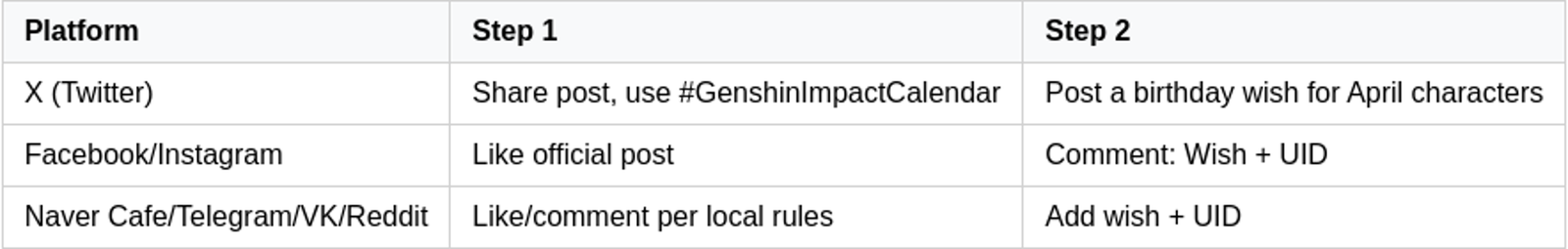 The event’s calendar images carry alt text describing beloved April birthday characters set against vibrant, region-themed backgrounds. Instruction graphics include step-by-step participation guides with social media icons and reminders to enter UIDs correctly.