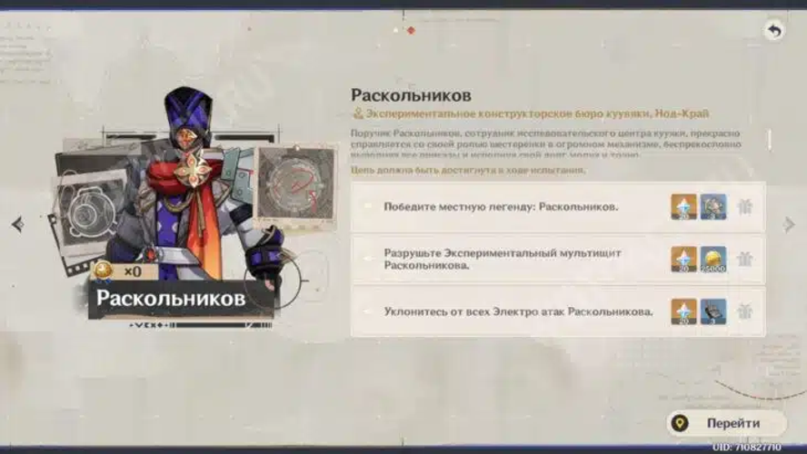 In Genshin Impact trifft man auf den herausfordernden Mini-Boss Leutnant Raskolnikov, der im Herzen des Paha-Inselzentrums im Kuuvyaki-Forschungszentrum stationiert ist. Diese Figur ist eine lokale Legende von Nod-Kray und kann erst nach Abschluss einer umfangreichen Weltquest herausgefordert werden. Der Kampf gegen ihn gestaltet sich deutlich schwieriger als die vorherigen Quests, da Raskolnikov seine volle Kraft demonstrieren möchte.